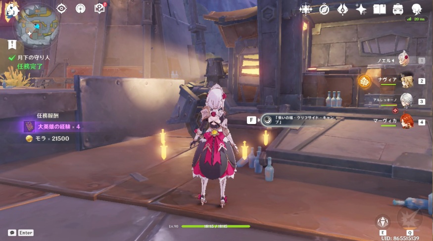 月下の守り人の任務報酬は、大英雄の経験x4、モラx21500です。