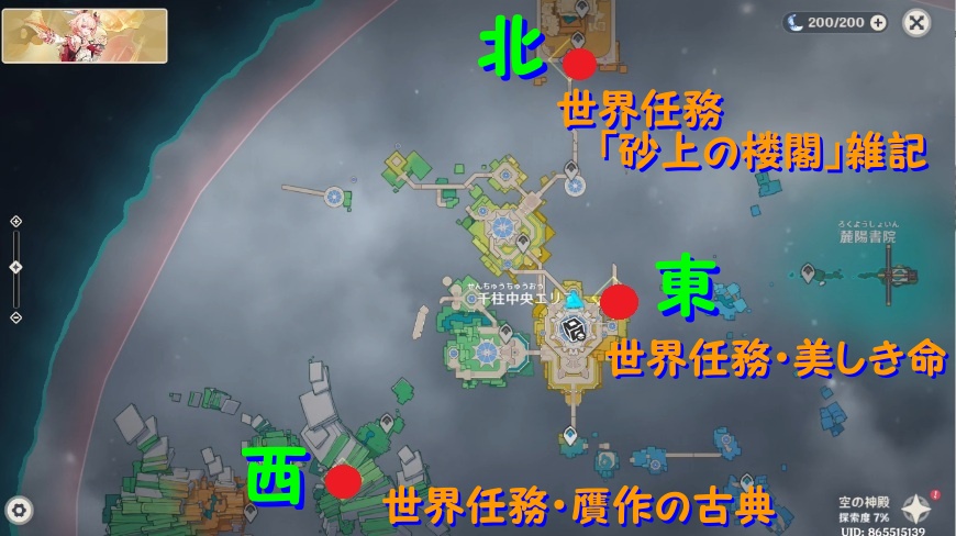 世界任務・風が止む終了後に表示される3ヶ所のマーカーポイントへ移動。3つの世界任務を完了すると一日千秋の神殿任務が完了します。