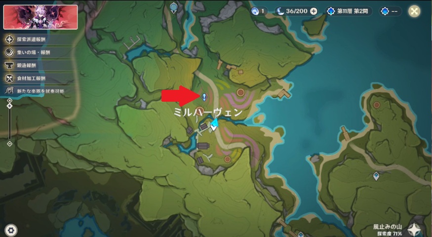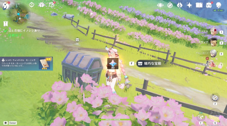 山と花畑にイノシシありの任務完了報酬は、原石x30、モラ37000です。それとレシピ:ウィンドミル・モーニングがもらえます。