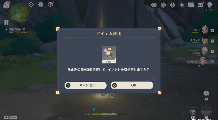3.アイテム使用画面が表示されたら、「OK」をクリックします。風止みの花はミルハーヴェンの花畑にあるので取っておきましょう