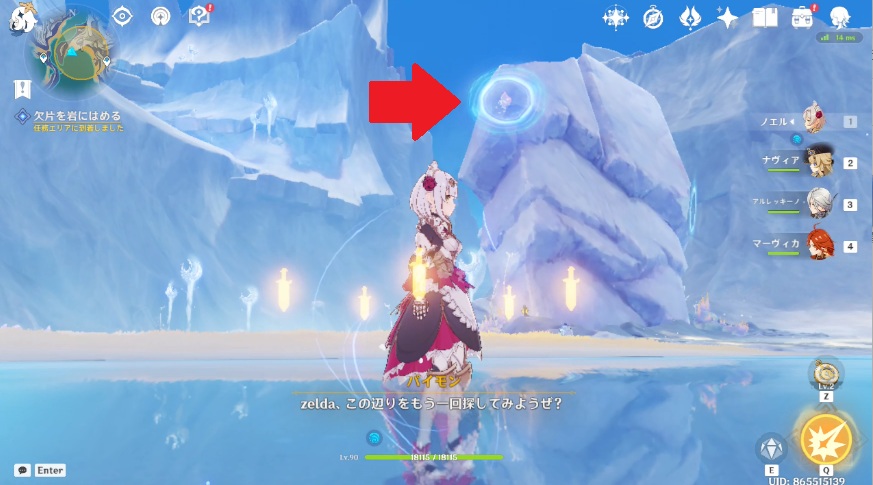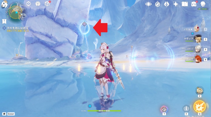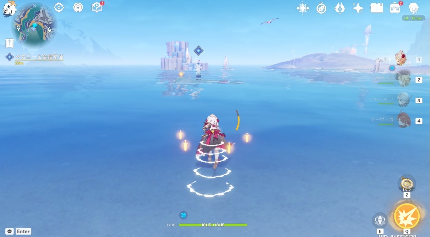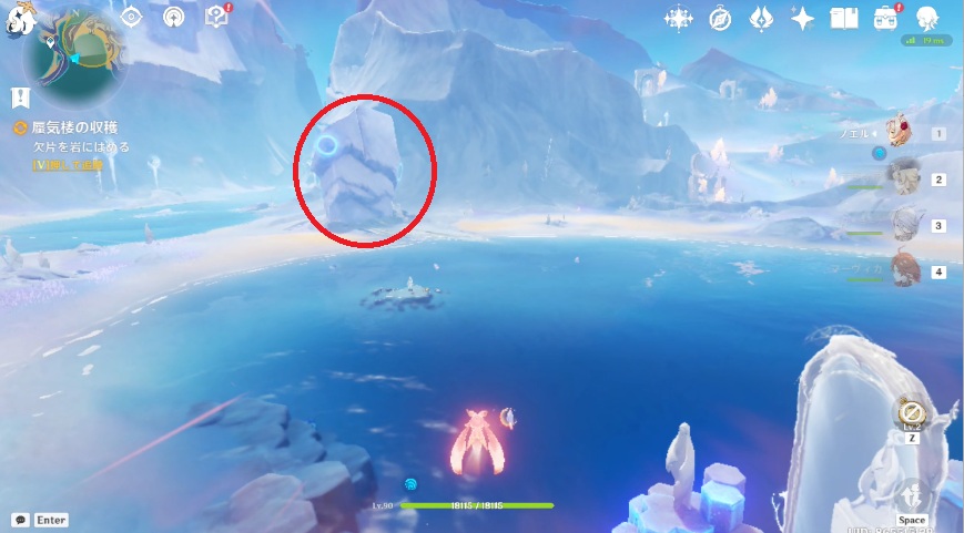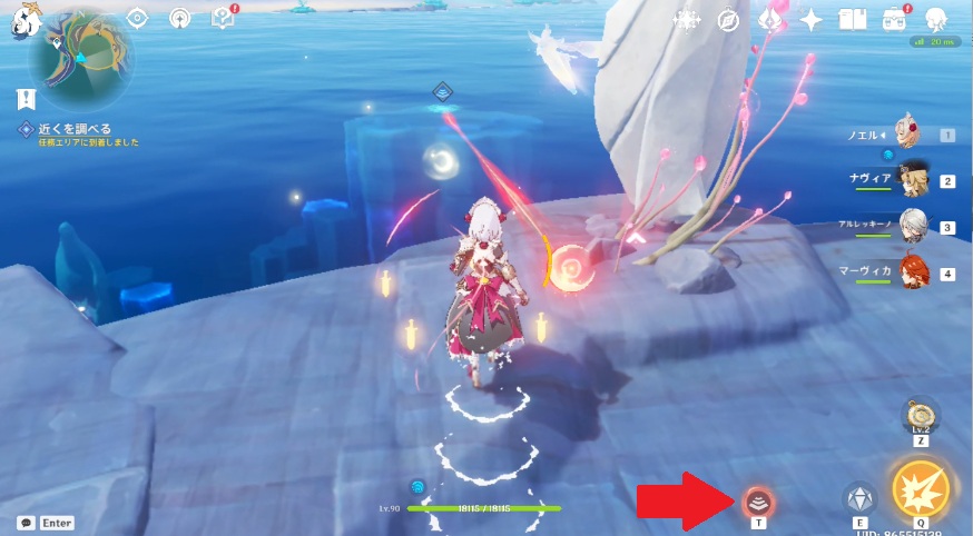 1.任務エリア南西に移動すると、海の中に石像がっている場所があるので移動します。水中の柱から赤い線が出たら画面下に表示されるボタンを押すと、水中から柱が出てきます。